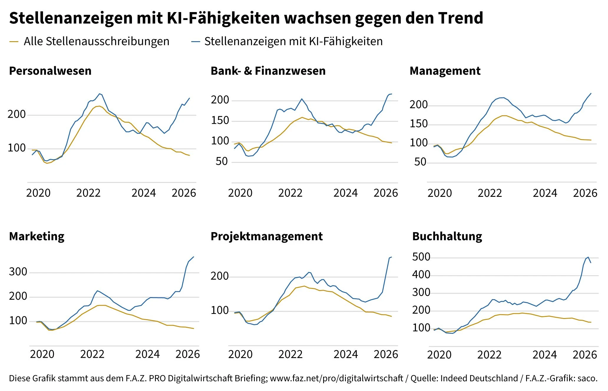 Obwohl viele Unternehmen mit Einstellungen zögern, legt der Anteil der Stellenanzeigen, die KI-Fähigkeiten voraussetzen, zu. Das Wachstum verschiebt sich von Techjobs auf Personalwesen, Marketing und Finanzen.